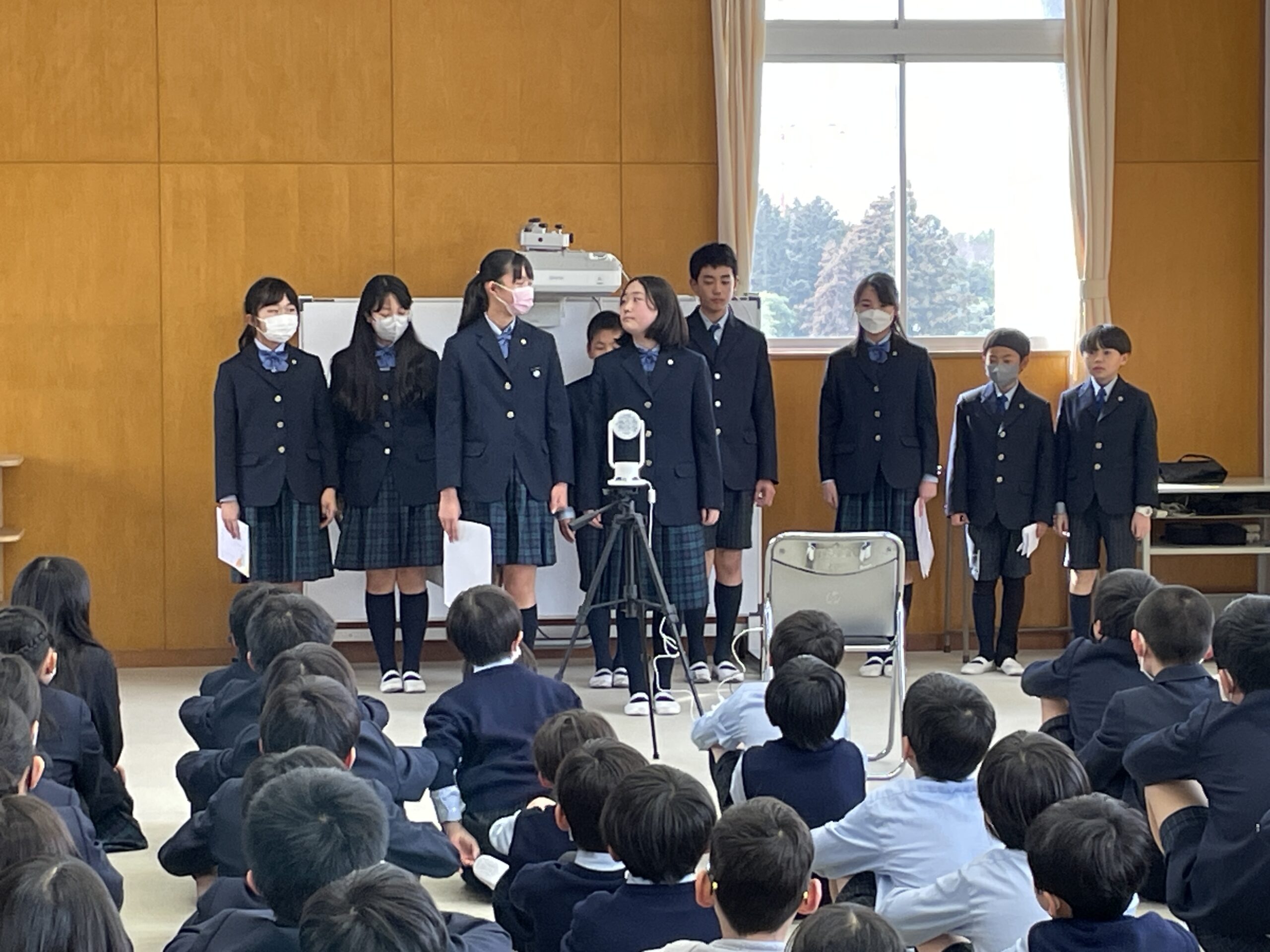 3月4日(月)今年度最後の児童集会を行いました。最後の児童集会は各委員会の委員長からと児童の会役員の人たちからの発表があります。各委員会の委員長の発表では今年度の反省と次年度の引継ぎ事項を4,5年生を中心に伝えました。児童の会役員の発表では、この半年間で印象に残ったことや成長した点、掲げた公約は達成できたかなどを伝えました。来年度は今の5年生が前に出て、津田学園小学校を引っ張っていきます。