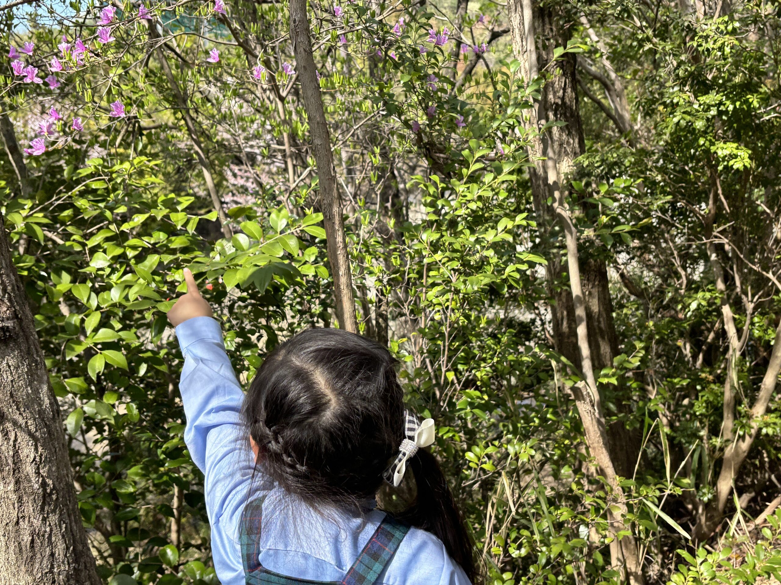1年生が里山で「春見つけ」を行いました。生活の授業で「春見つけ」を行いました。学校の里山を始めて本格的に探索して「春」を探しました。きれいなお花や、不思議な形の木などいろんなものを発見していました。四季折々変化する里山です。これからもたくさん発見してください。