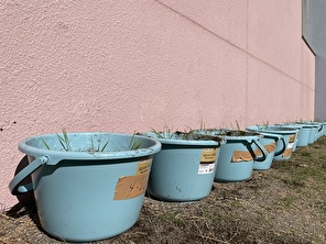 4年生が田植えで使用した稲の余りを利用してバケツ稲を小学校でつくりました。まず、バケツに土を8割ほど入れ、そこへ水を入れました。その後、しろかきを行い、土と水を馴染ませました。一人2~3本ほど稲を植え完成です。今後は稲の成長を観察、記録をしていきます。