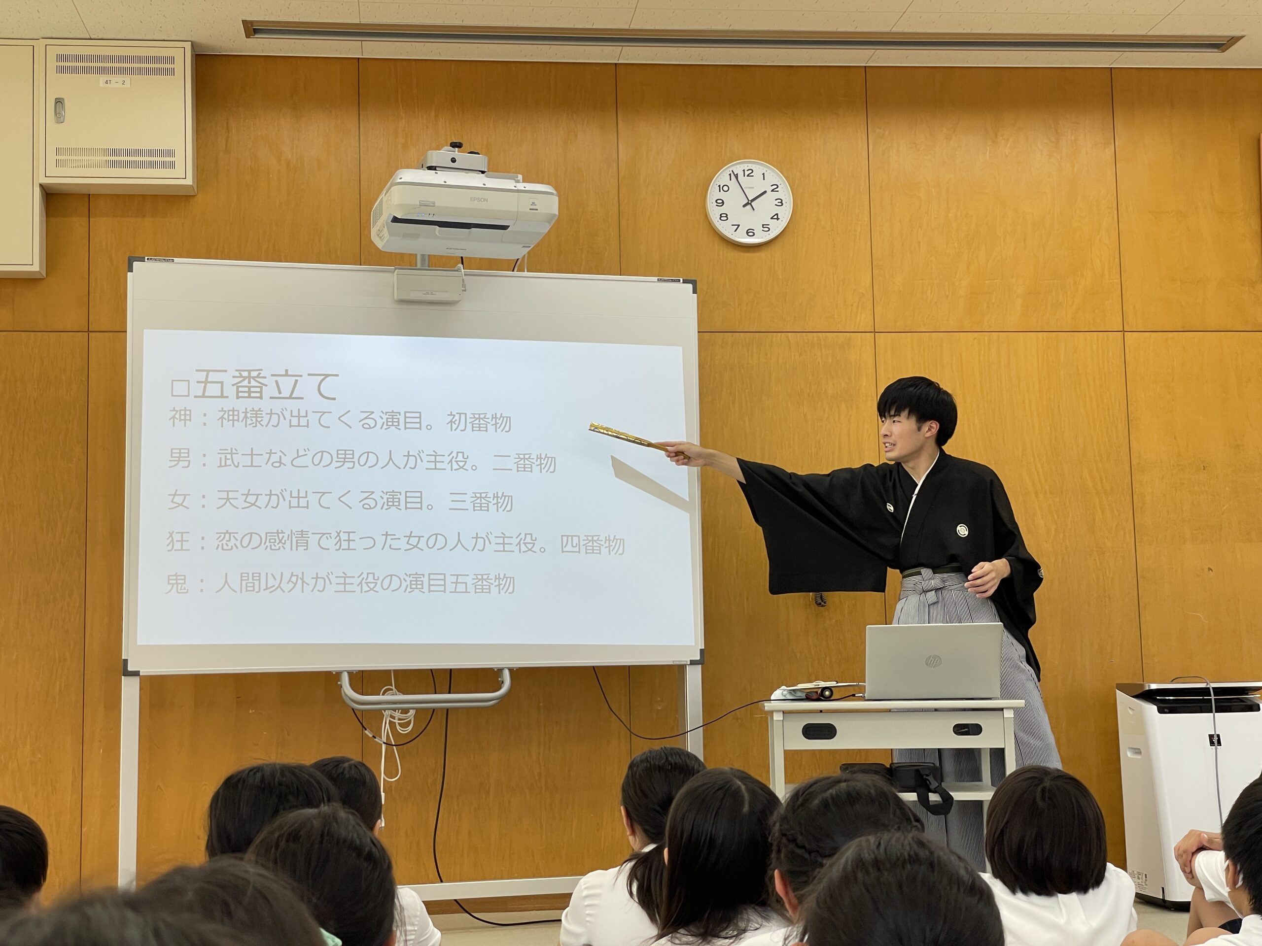 5年生が、能楽の出前授業に参加しました。能と狂言の違いを理解し、能には神・男・女・狂・鬼の5番立てで構成されていることがわかり、実際に舞や謡を見た子どもたちは興味津々でした。水曜日に行われる親子ふれあい教室の事前学習にもなり、子どもたちは良い学びを得たと思います。