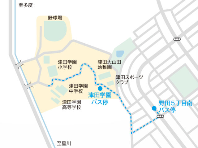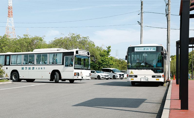 JR桑名駅または近鉄桑名駅東口より、三重交通バス「32番系統、津田学園行き」にて「津田学園」下車、または「47・48番系統、大山田循環」にて「野田5丁目南」下車徒歩3分、いずれも乗車時間は15分程度です。