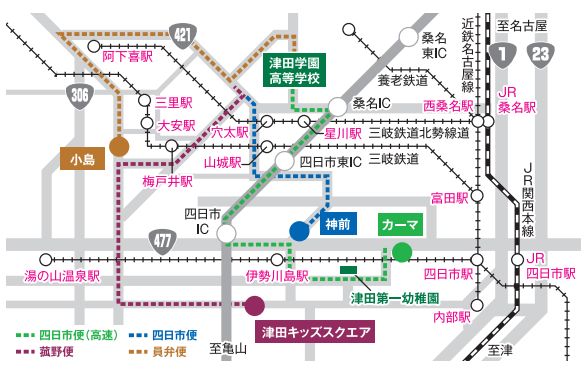 ■帰り/ 15:50 津田学園→16:04 八風念仏橋→16:11 三岐あさけが丘団地下→16:19 中野町→16:24 永井→16:29 イオンタウン菰野前→16:34 桜花台→16:38 西山町(ファブリカ前)→16:41 小山田記念温泉病院→16:49 津田キッズスクエア→17:01 津田第一幼稚園