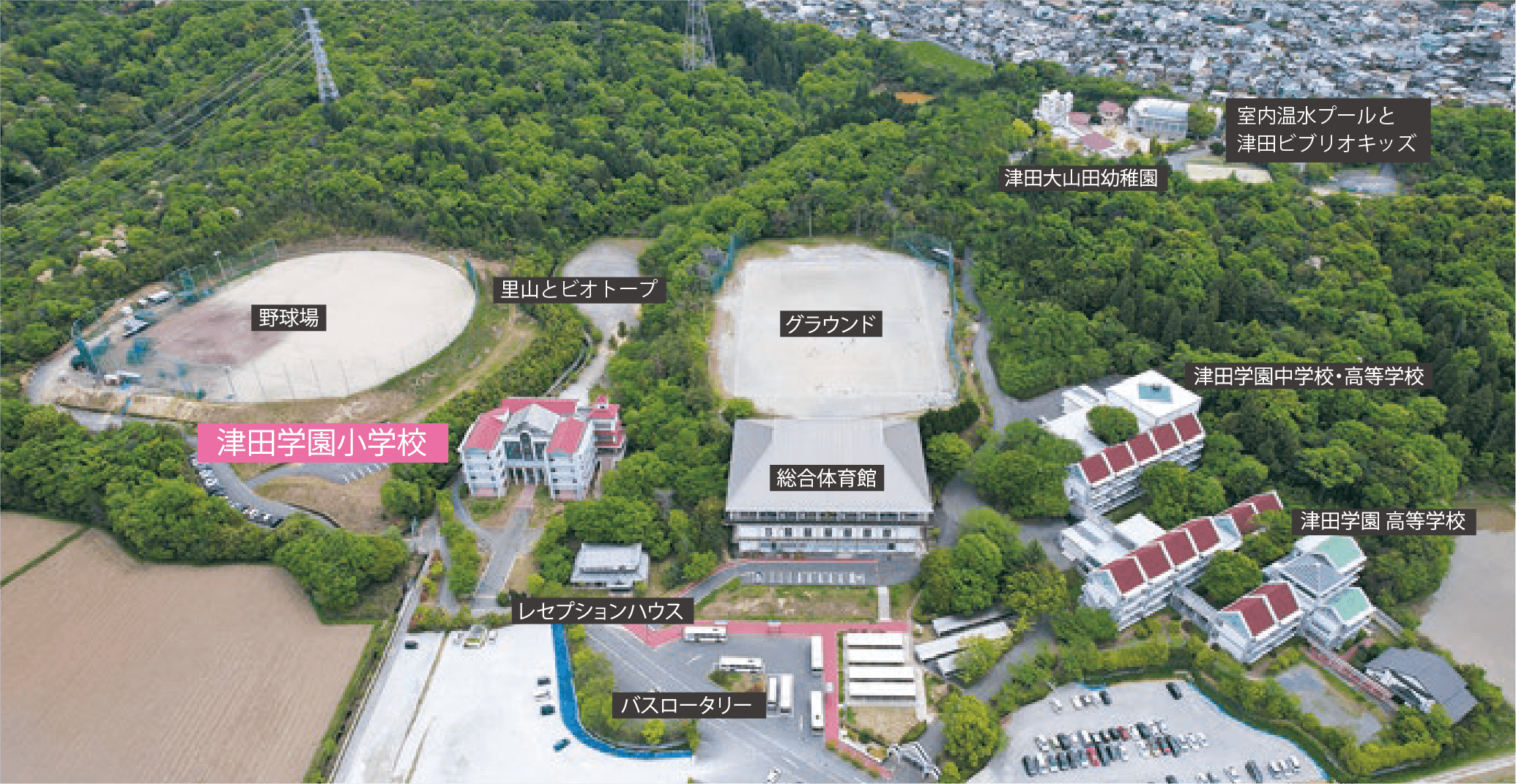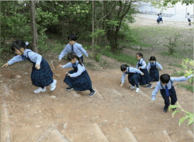豊かな自然に恵まれたキャンパスでは、鮮やかな四季の移り変わりを感じることができます。敷地内には様々な施設がゆとりを持って配置され、のびのびと学べる環境が整っています。閑静で学習に集中できる落ち着いた雰囲気と、おいしい空気と明るい陽光に包まれた学び舎が、子供たちの可能性をさらに伸ばします。