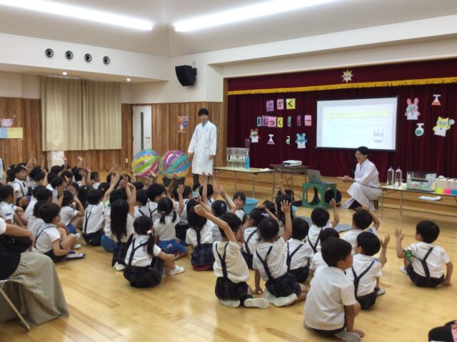 夏期保育にて、年長組が津田学園小学校教諭によるかがく講座に参加しました。ペットボトルを振って渦巻きを作ったり、大きなボールを飛ばして空気の重みを感じたりと興味津々な様子の子ども達。沢山の経験を通してかがくについて楽しく知