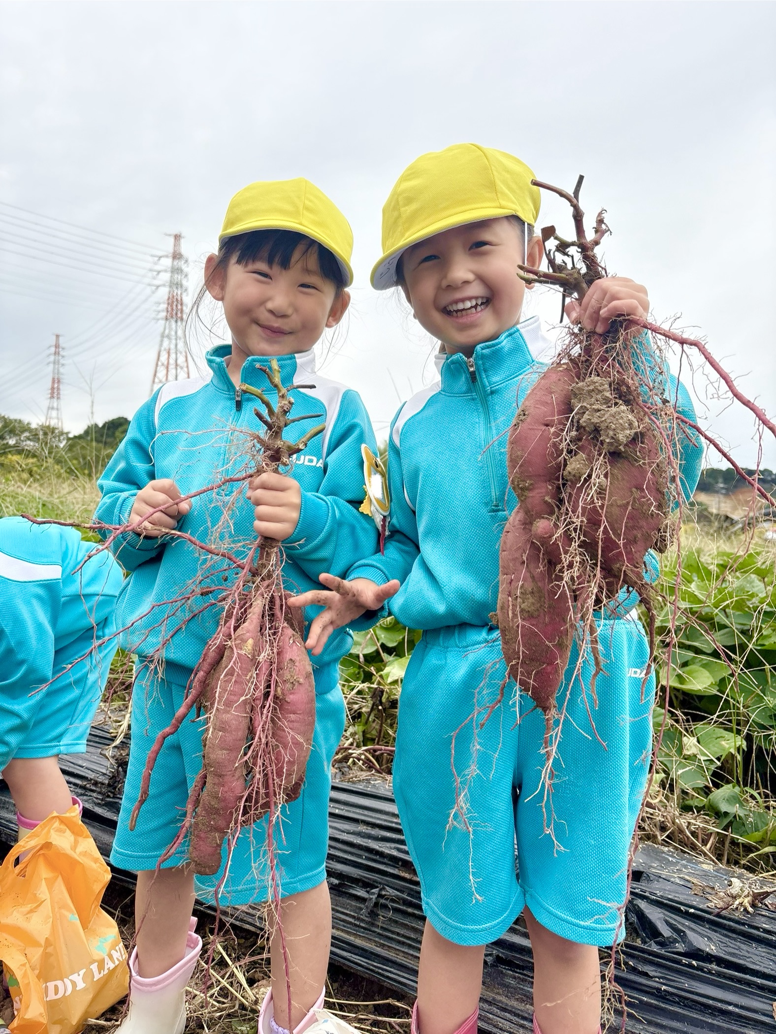 園外保育で水の谷農園へ行き、いもほりを行いました。一人一人持ってきたスコップを使って自分の力で一生懸命掘っていた子ども達。土の奥深くにたくさんのさつまいもがついているため、父母の会のお母さんやお父さんに手伝ってもらいなが