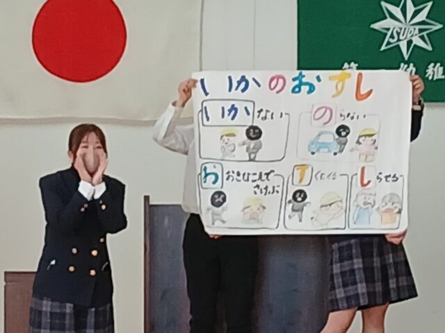 ホールに子ども達が集まり、春休みの過ごし方や、交通安全、防犯について、職員劇を観て、一緒に確認していきました。