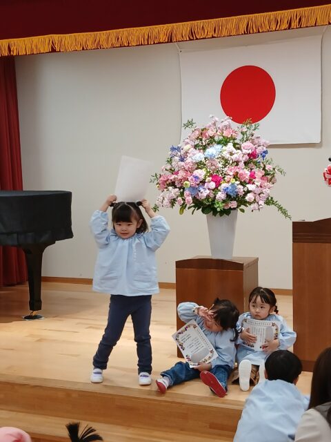 3月23日にキララクラブ最後の日となるはばたきの会を行いました。1年間元気に登園した子ども達一人一人に園長先生から修了証書を受け取りました。笑顔いっぱいで嬉しそうに受け取ることができました。4月からも、友達や保育者と一緒